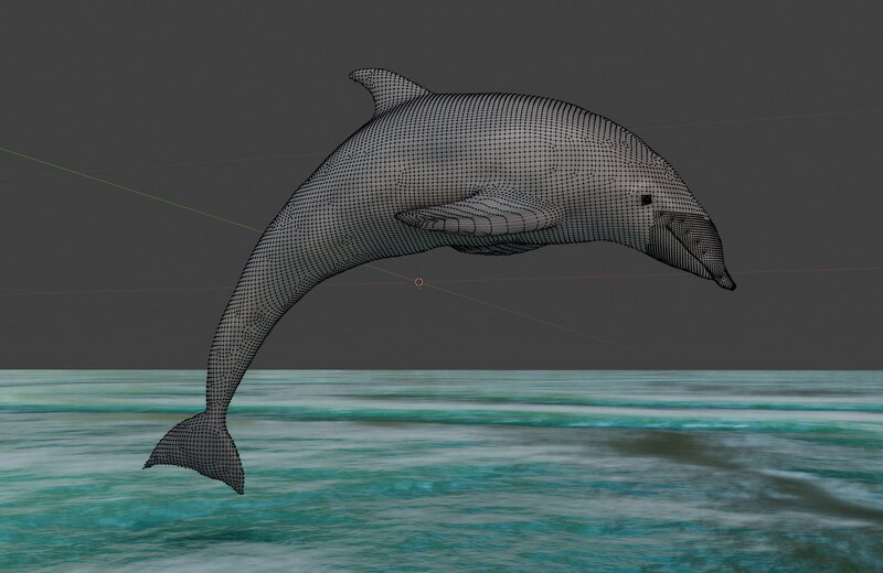 A dolphin jumping. 16k verts / 32k faces. Vertex colors with a separate material for shiny black eyes.