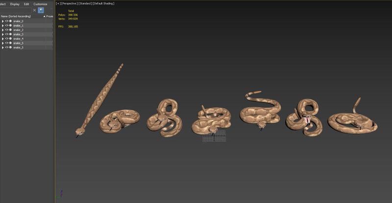 The rattlesnake 3d model Here it is rattlesnakes in six different poses and another one as a billet, which you can use to make your own poses of snake. All objects and all the materials have logical names. Rattlesnake has UVunwrap. Texture prepared by hand. Models and materials are prepared for rendering in Vray.