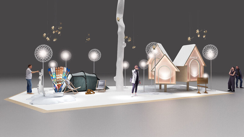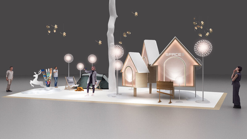 mall display pop up store Warm Winter Olympics ice and snow cabin tent dandelion